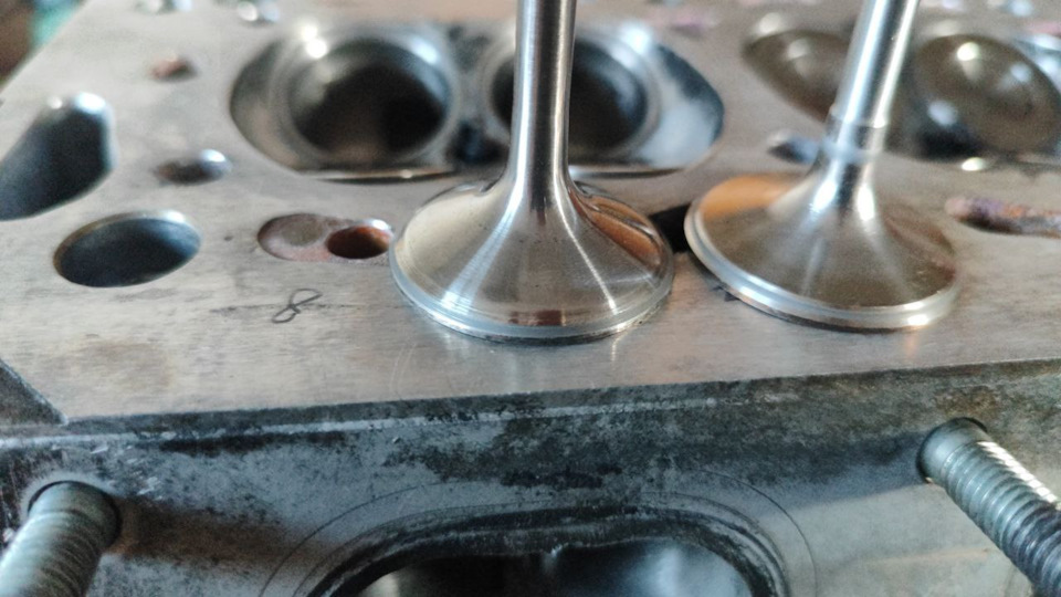 И тут мне подогнали клапана 35мм! Все разбирать и переделывать под 35. Фаски, седла… Вначале продул все на недоработанных, без 30 градусной фаски клапанах. Получил прямо великолепный приход везде. Далее по фен-шую и по всем канонам делаю 30 градусную фаску на клапане и… Ничего. Вообще ничего. Ничего не пришло. Я с таким сталкиваюсь впервые. Искал причину, ничего не нашел.
