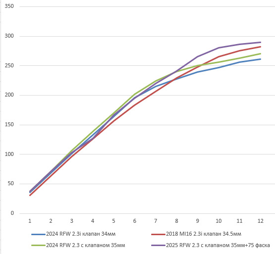 75 фаска до 7мм ничего не дала… Даже упало на малых подъёмах. Например на 4мм упало почти на 10цфм. Зато какой приход получил на большом подъёме. На 11мм аж +20цфм почти, у меня закончилась мощность стенда и я не увидел финальные цифры. В табличке 285цфм на сток канале, с масками на клапанах и седлах и доработанном около клапанном пространстве при падении давления с 28дюймов водяного столба на 26дюймов (простыми словами, стенд не смог поддержать разряжение и простотсдулся, головка продулась больше чем смог обеспечить стенд). На вскидку это будет примерно 290цфм на 11-12мм и скорость потока в канале 95м/сек.