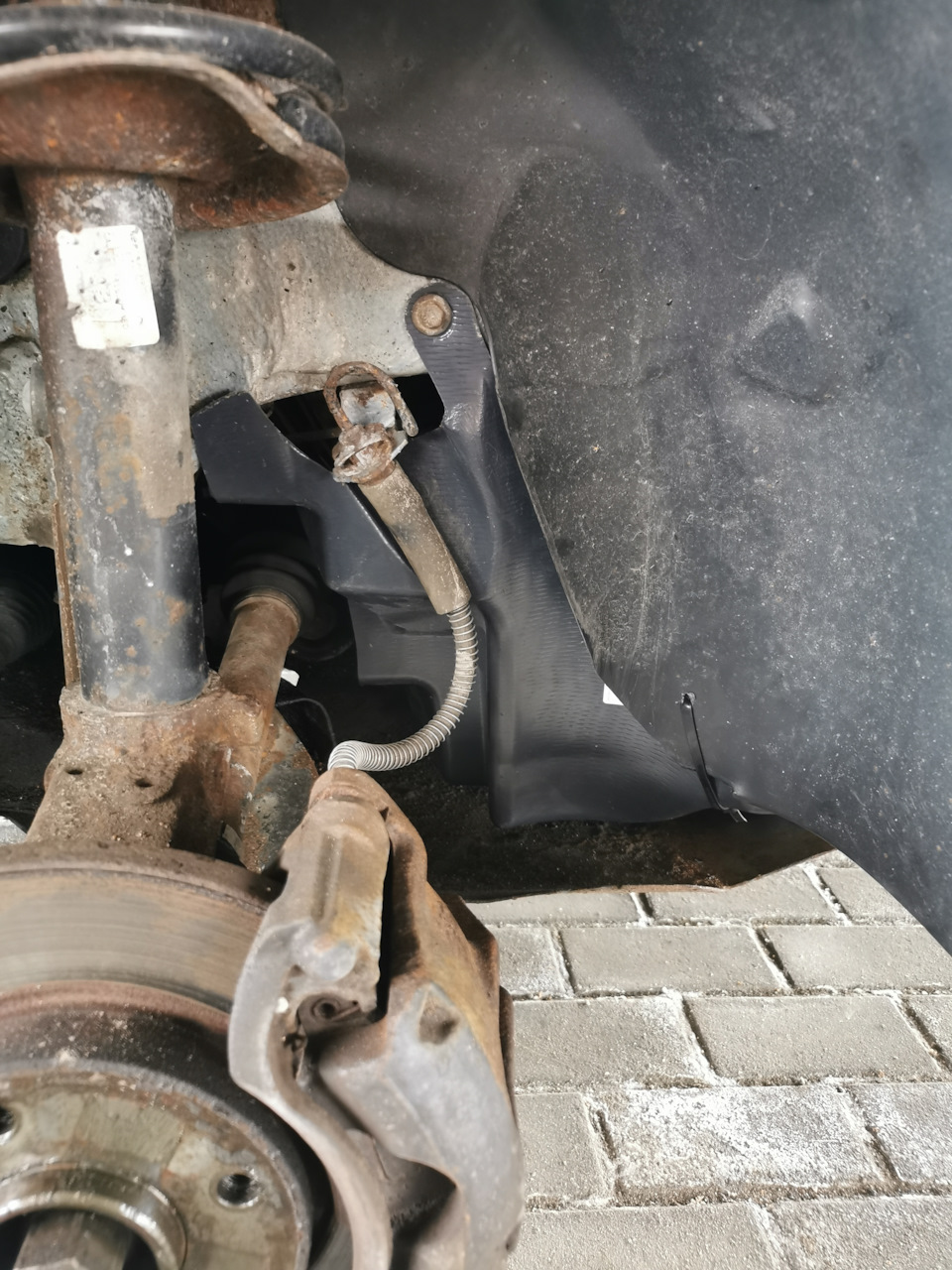 Процесс установки: снимаем правое переднее колесо, снимаем защиту арки колеса (у меня она держится только на пластиковых клипсах). Добавляемая защита крепится двумя болтами к кузову. В нижней части закрепил стяжками к защите арки, так как установлена не оригинальная металлическая защита поддона и не хотелось сверлить в ней дырку.