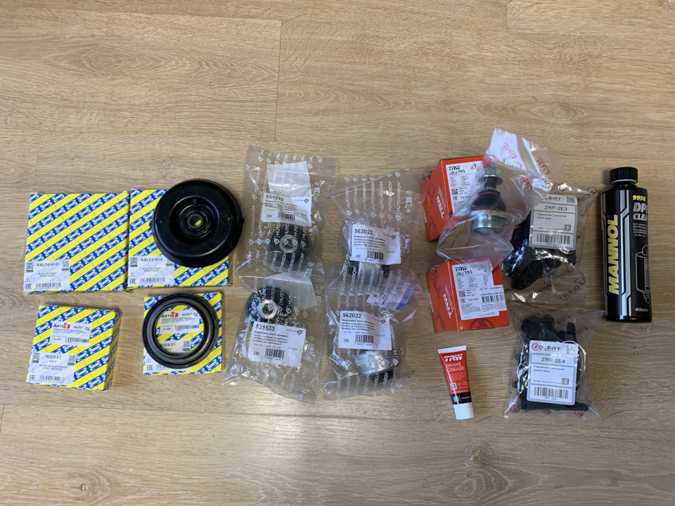 При повороте руля начал появляться «закусывающий» звук, а при проезде на неровностях немного начала греметь передняя подвеска. После осмотра специалиста, решено заменить комплект опор стоек амортизаторов с опорными подшипниками, шаровые опоры и по две пары сайлентблоков на передних рычагах: