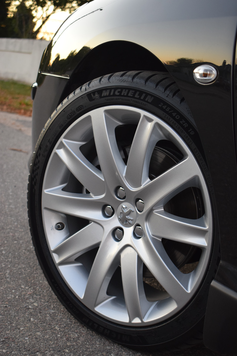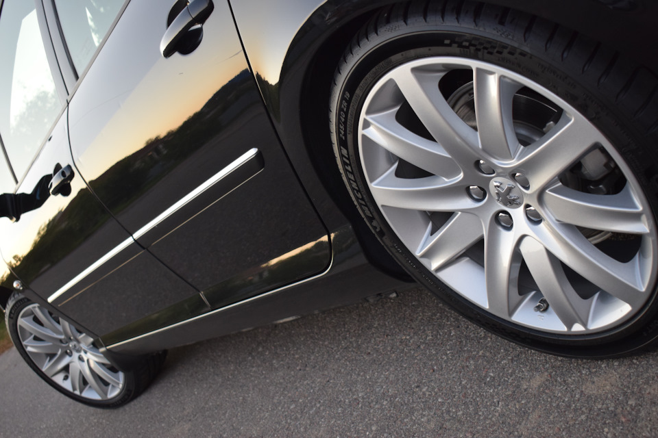 Ну что ж, попробовал я то, чего никто, никогда не делал — размер шин 255-40-19 на Peugeot 407, итог — не понравилось совсем, для этой машины это перебор, так же как и для диска j8 19. Хотя к выбору этого размера подошёл со всей ответственностью, многократно рассчитывал каждый миллиметр в шинно-дисковом калькуляторе на предмет подтираний. Изучил все БЖ соплатформенников с5х7 кто ставил такой размер, а таких там с десяток наберётся — ни одного негативного отзыва в плане ощущений отмечено не было. Сразу после приобретения шин обул только одно колесо и поставил его на перед для тестирования и с полным выворотом в обе стороны, сделал короткие движения для полной уверенности.