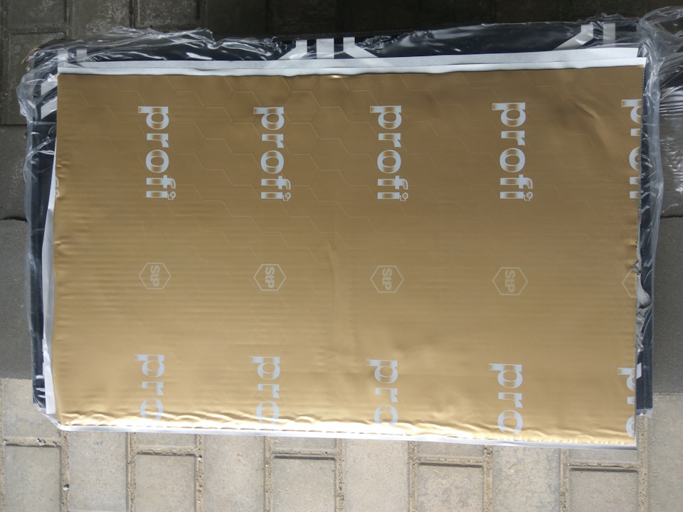 Листы виброизоляции. Верхний слой золотистого цвета. Обратите внимание, что данные листы меньше размером, чем другая линейка Stp. А ценник не ниже.