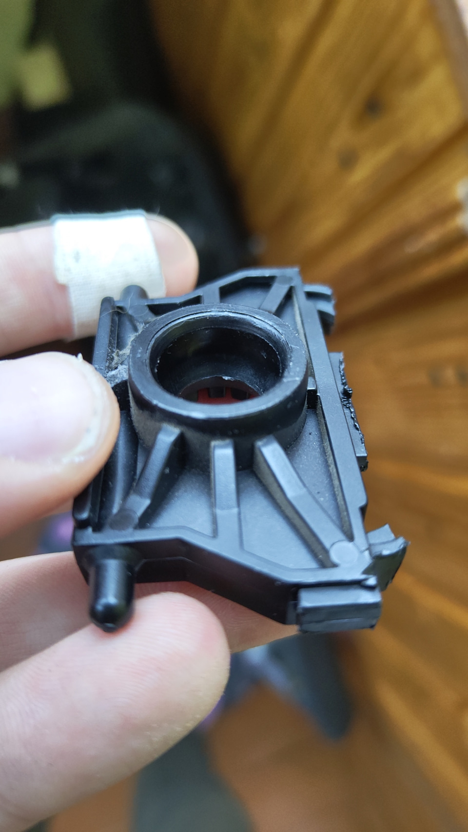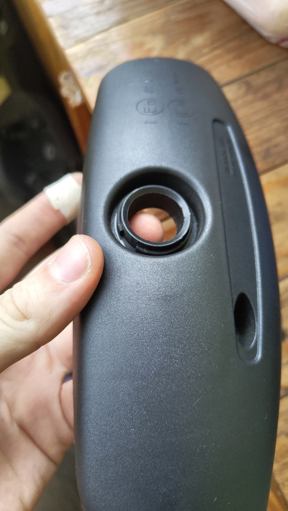 Далее, в яблоке родного крепления просверливают отверстие, через которое в дальнейшем пройдут провода. Отверстие делал сверлов 2мм, далее расширил до 5мм.