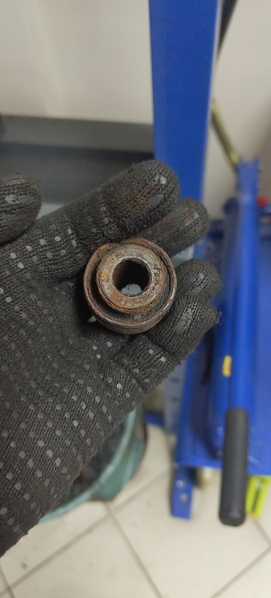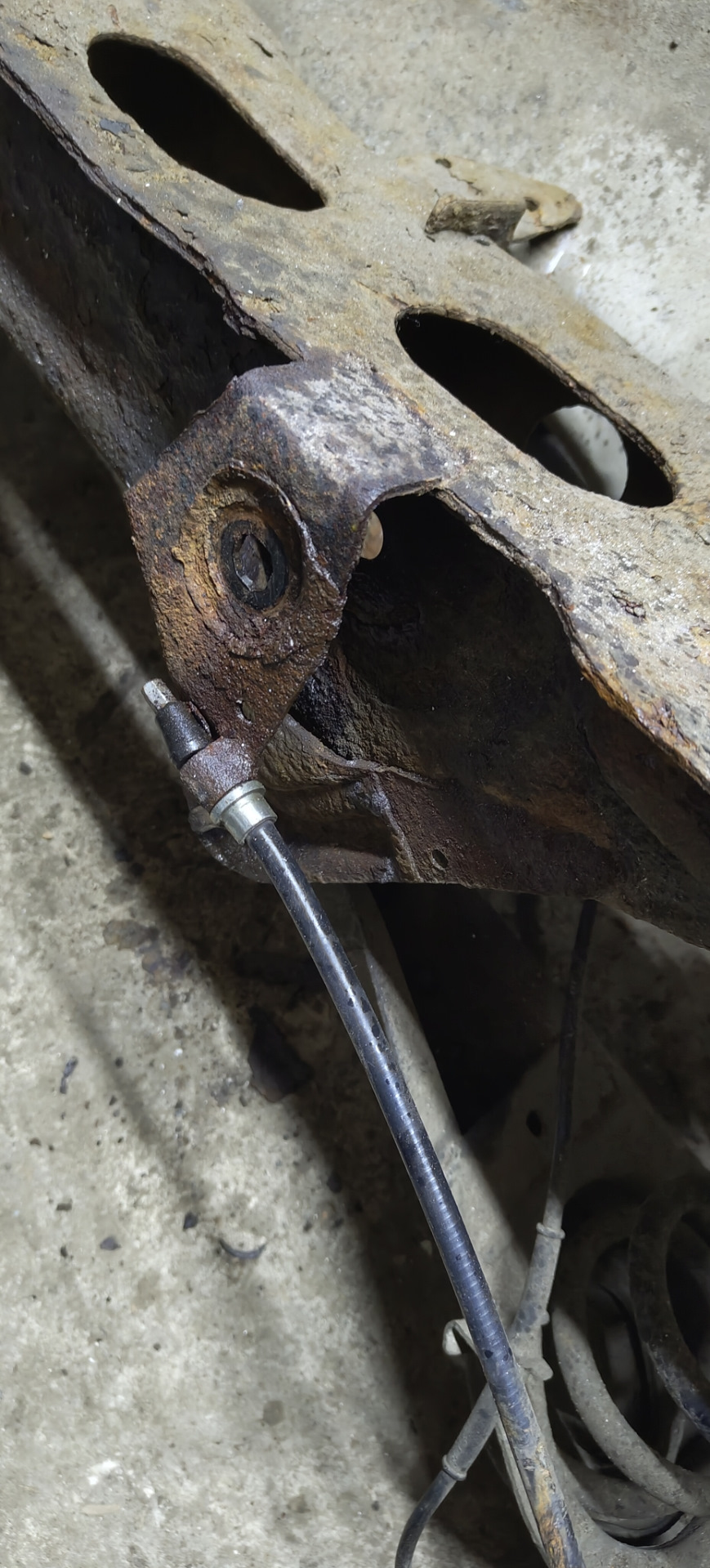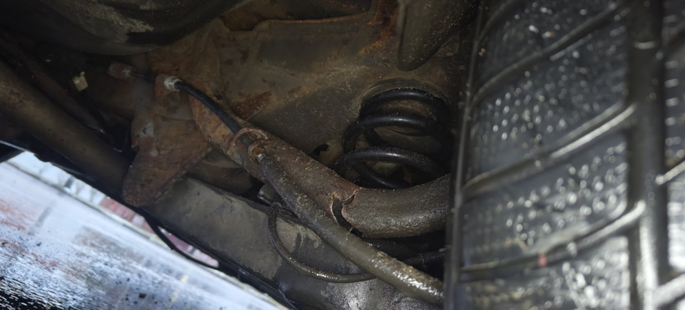 За пару дней до событий, заметил, что машина просела на правую сторону. Хотел заняться этим на выходных, но случилось раньше. При выезде с заправки колесо сложилось внутрь и, кроме сгнившего, как оказалось, поперечного рычага, сломало ещё и продольный.