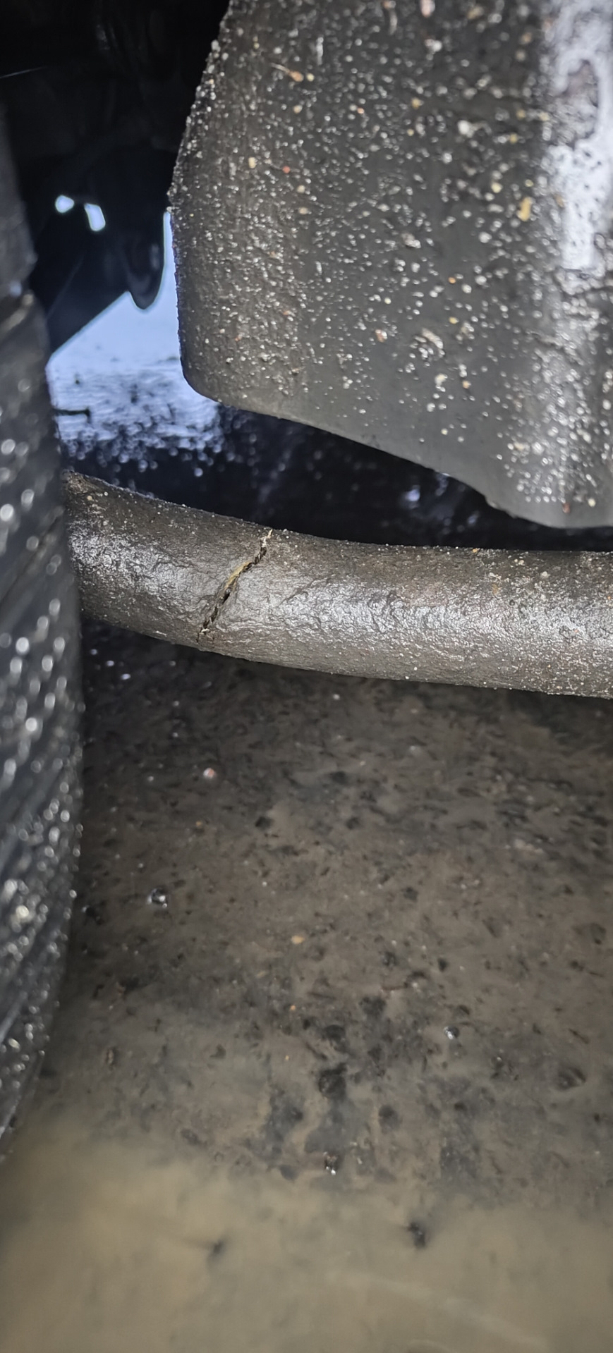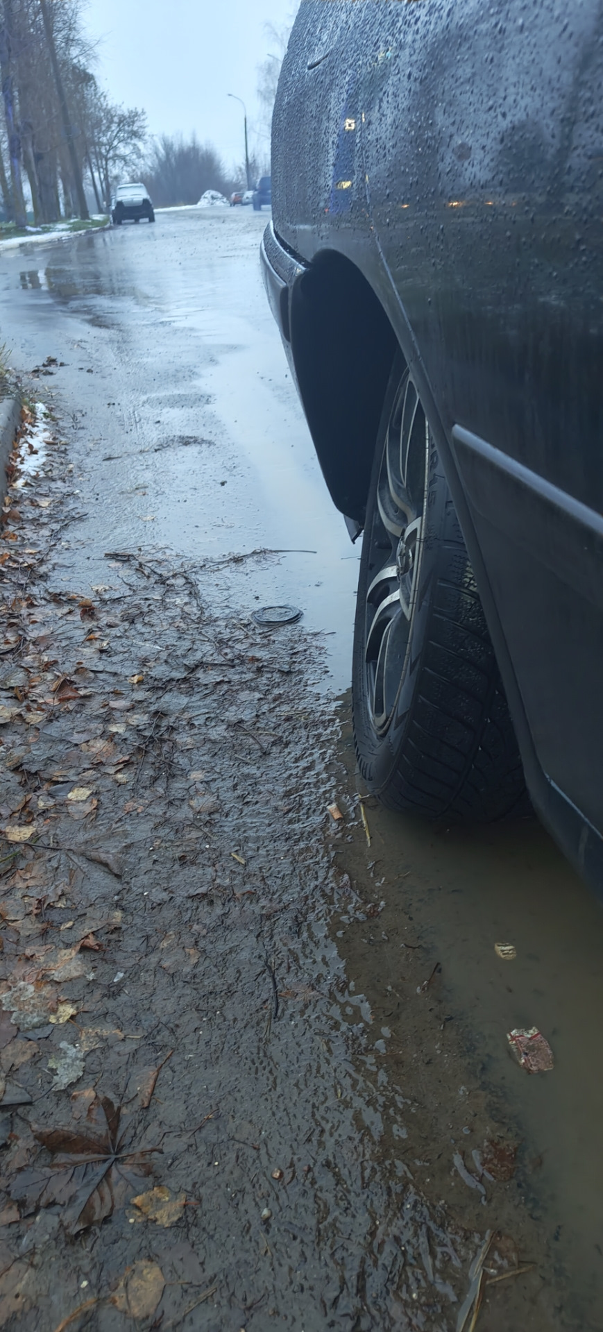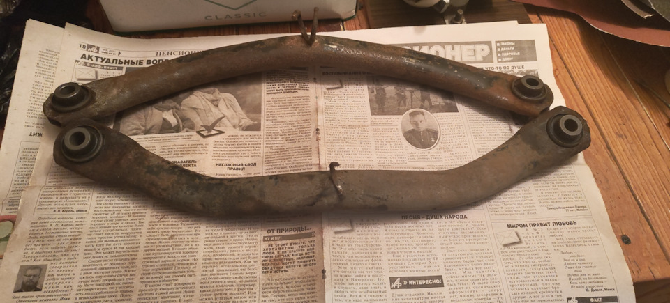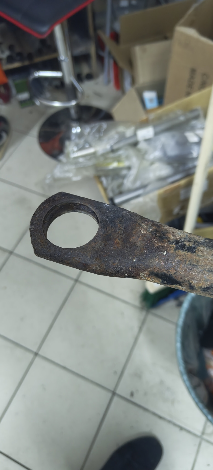 За пару дней до событий, заметил, что машина просела на правую сторону. Хотел заняться этим на выходных, но случилось раньше. При выезде с заправки колесо сложилось внутрь и, кроме сгнившего, как оказалось, поперечного рычага, сломало ещё и продольный.