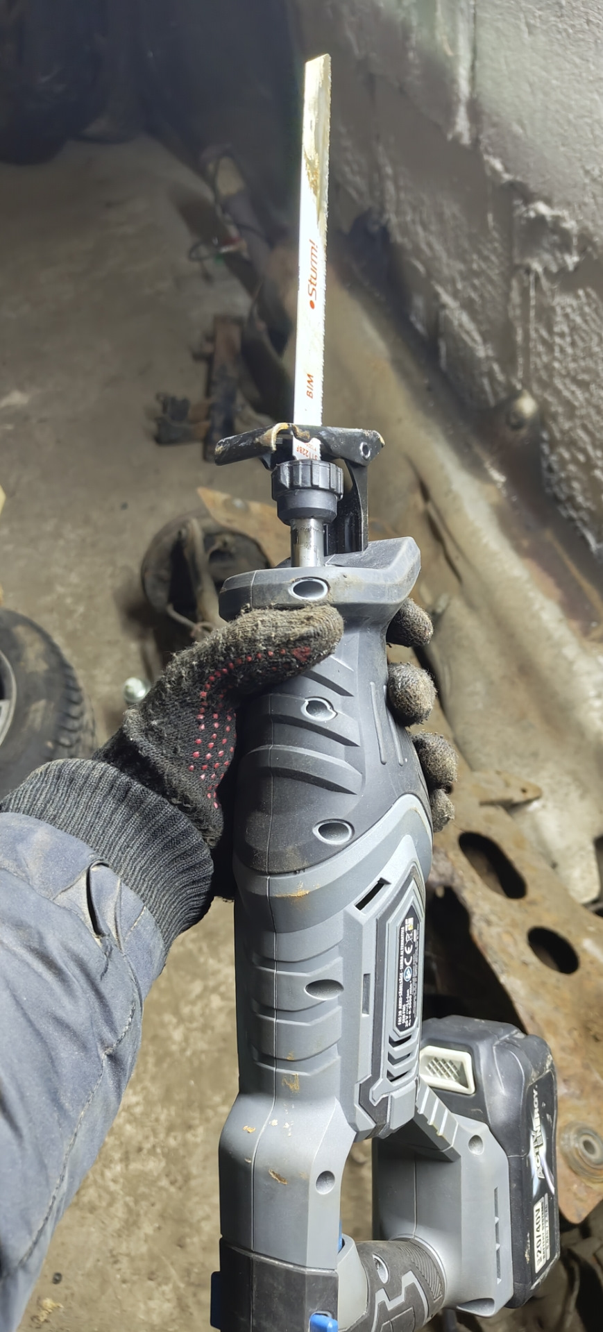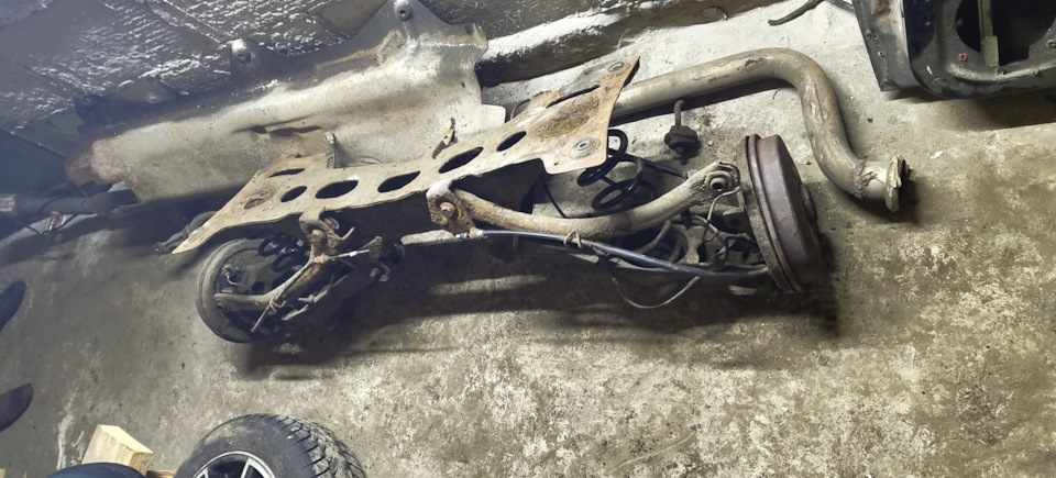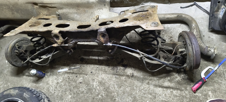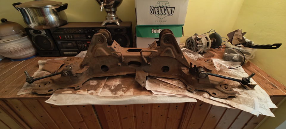 По поводу снятия поперечных рычагов (в простонародии "сабель") общеизвестно, что они меняются на снятом подрамнике. В моём случае, их никто, ни разу не менял. Однако, болты подрамника открутились удачно. Далее, сабельной пилой удалил болты рычагов (головки сгнили намертво)