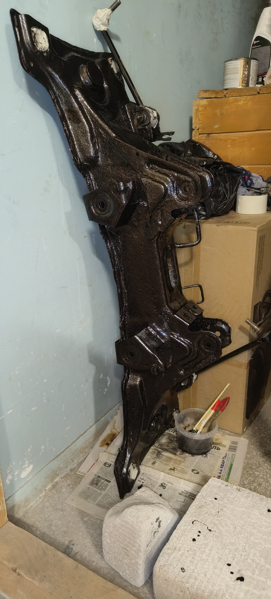 Далее, очистил щеткой по металлу+наждачной бумагой рычаги и подрамник от рыхлой коррозии, обработал в два слоя "цинкарем" и покрыл, так же, в два слоя молотковой краской.