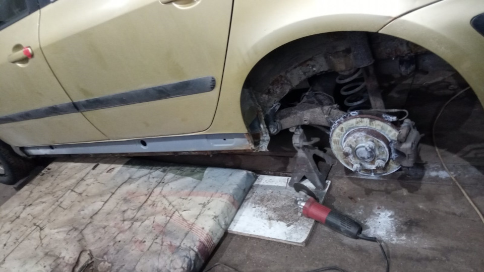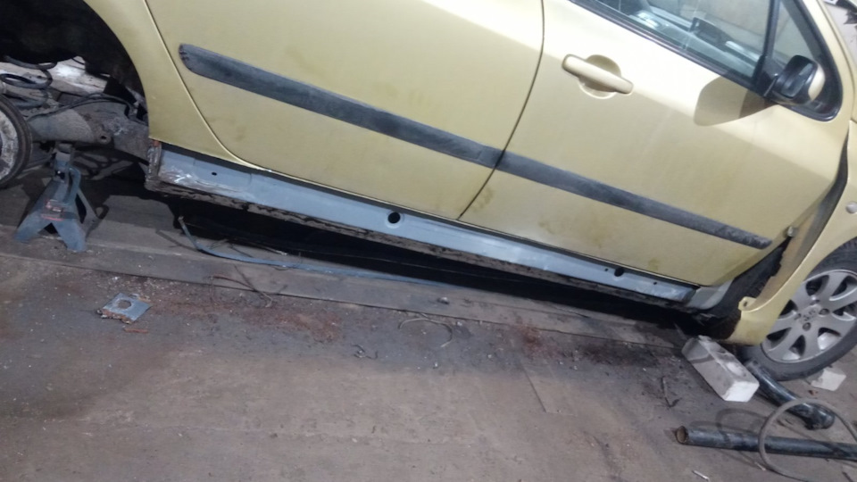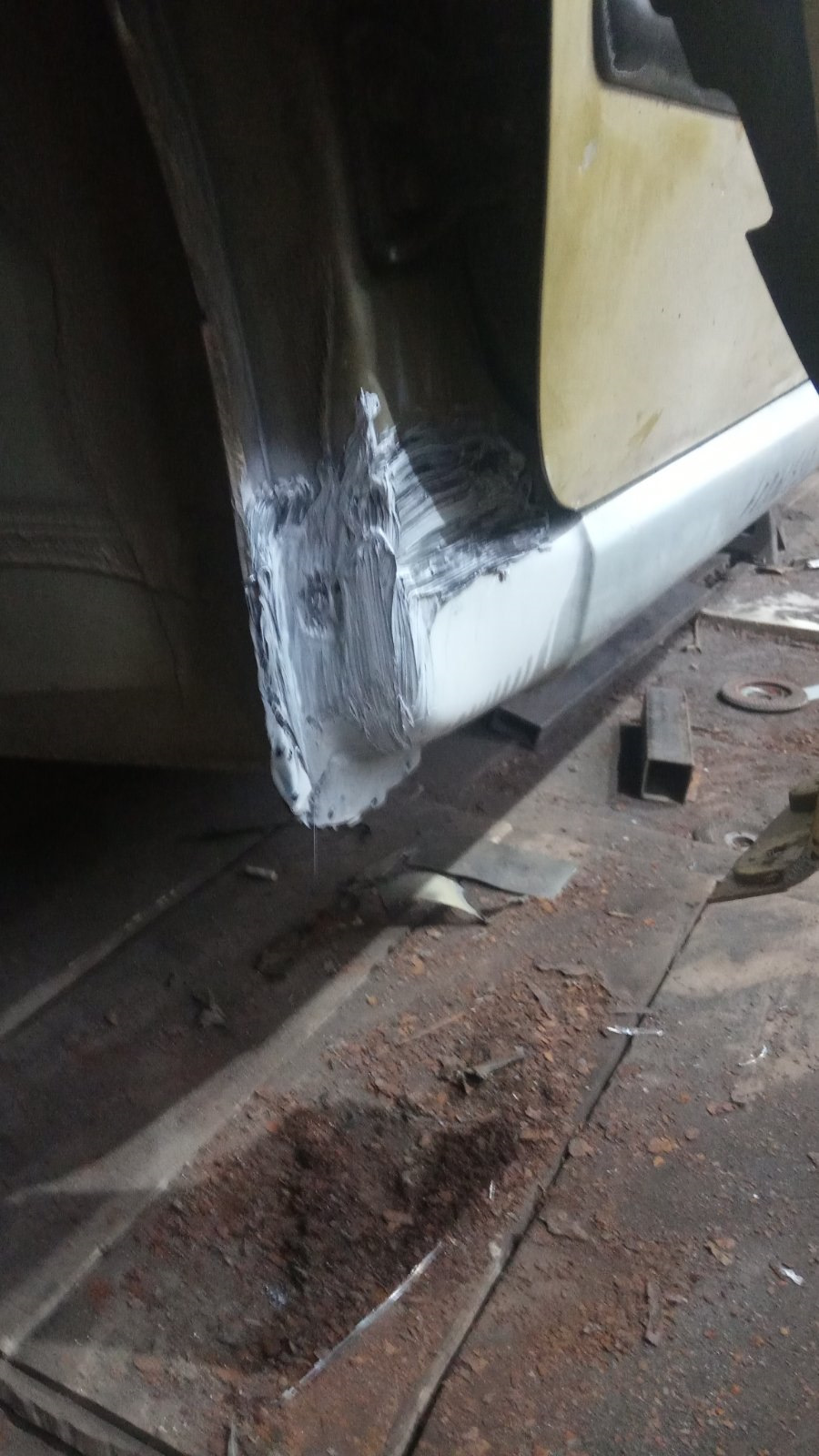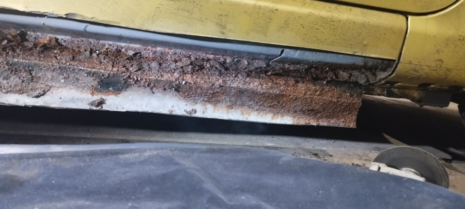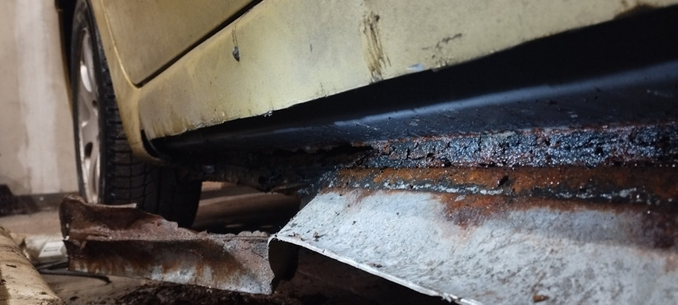 Осень 2022 года. При попытке поднять автомобиль для замены колес домкрат сказал «ням-ням» и сочно впился в порог, попробовав его на вкус. Автомобиль скзал «Ой». Тут я немного приуныл… В кармане денег не густо, а замена порогов дело не дешевое. Проведя небольшие исследования, средняя цена на ремонт порогов с покраской на зиму 2023 года составиляло 700 у.е. ( 48 000 рос руб).