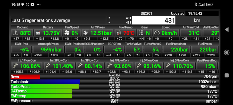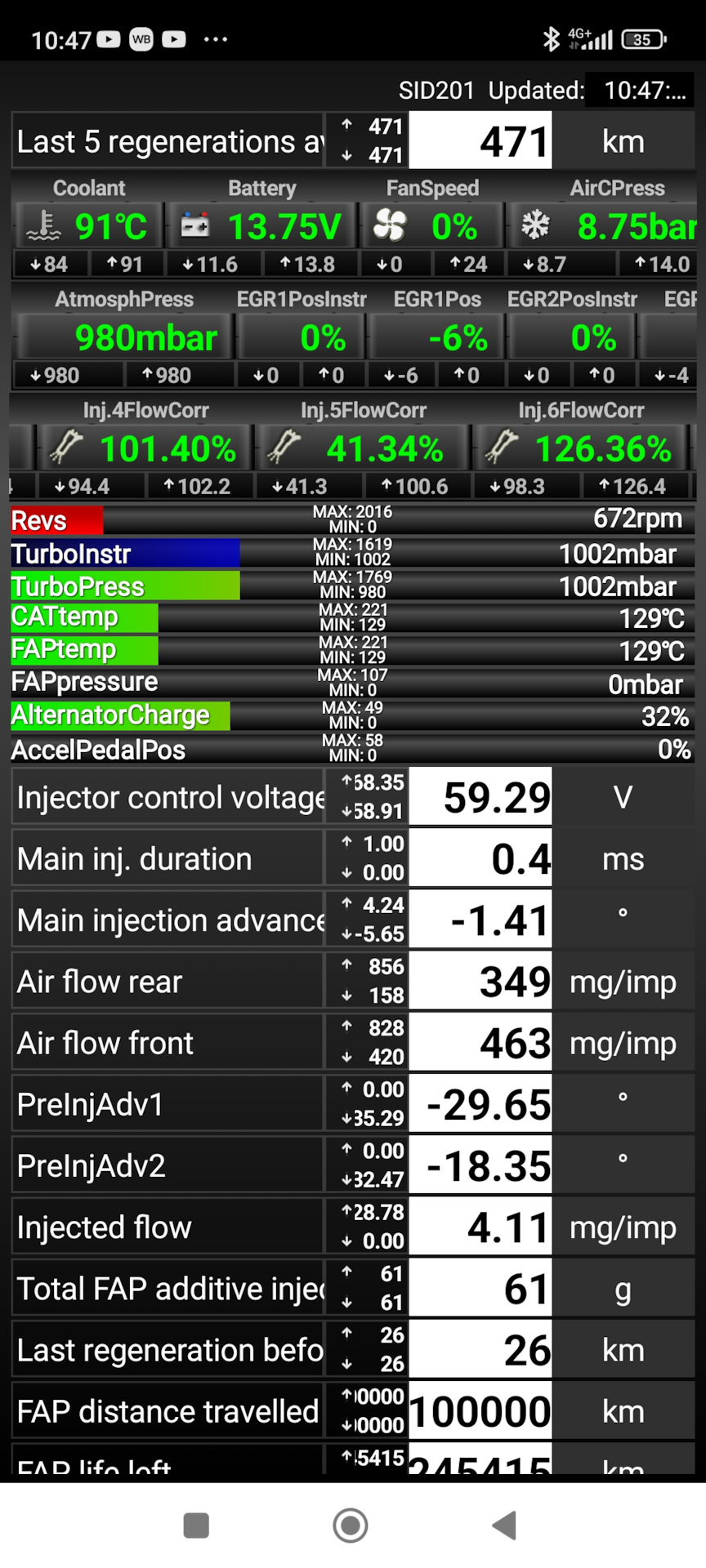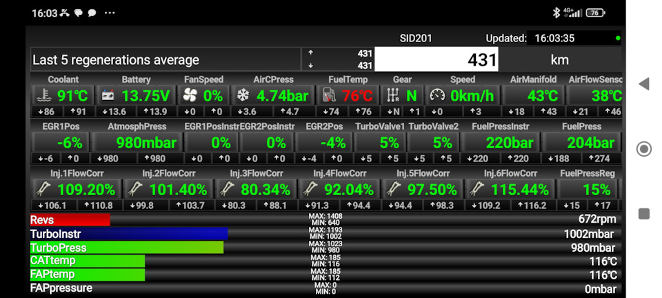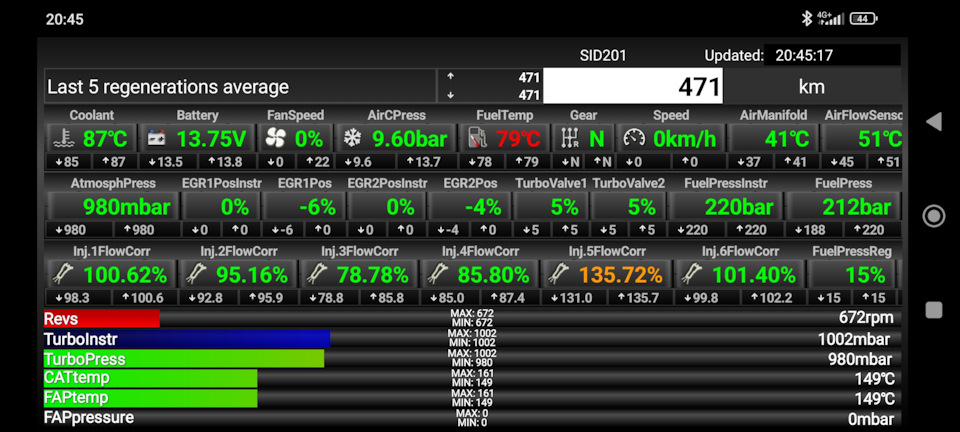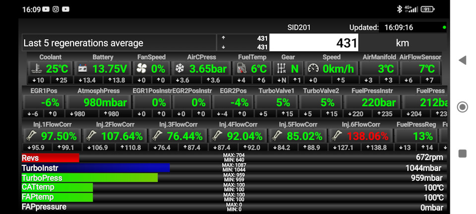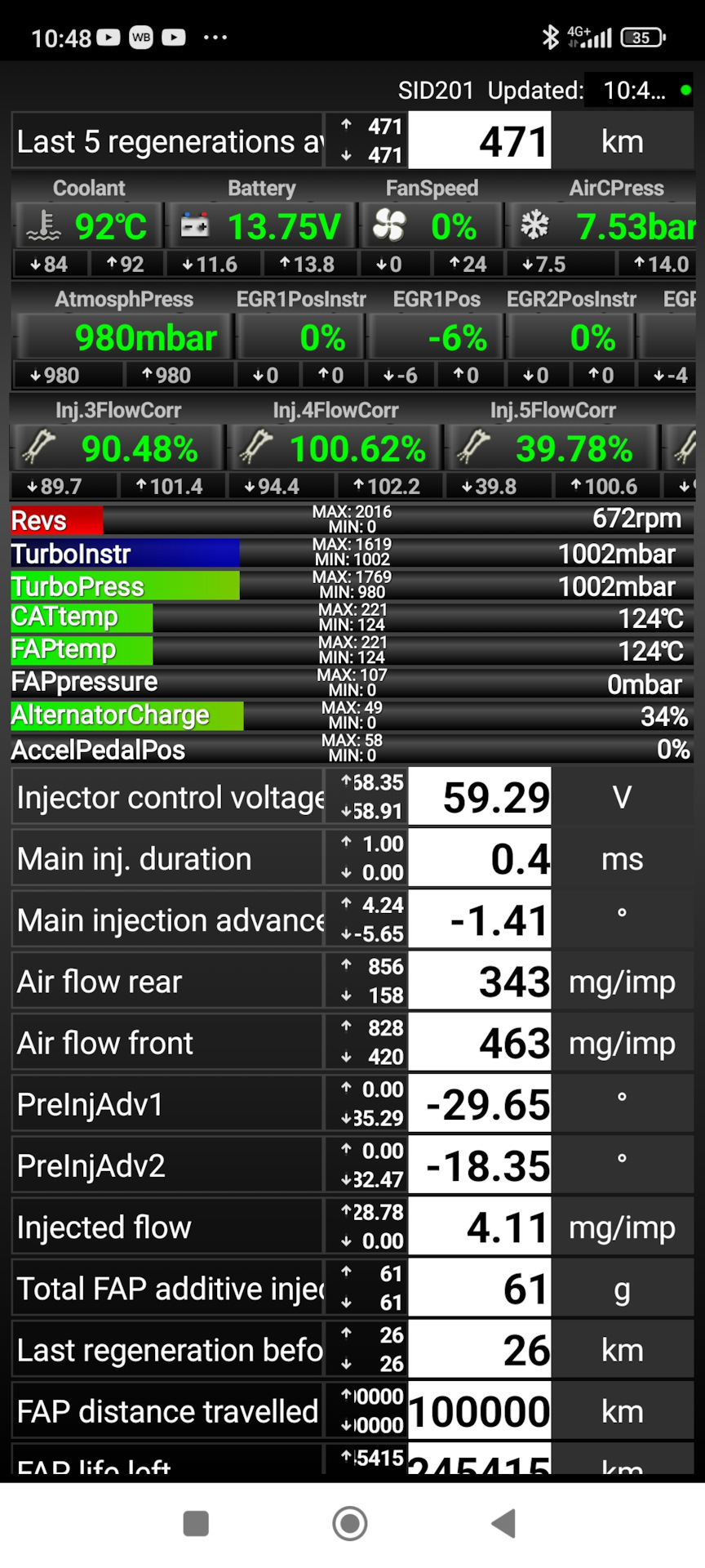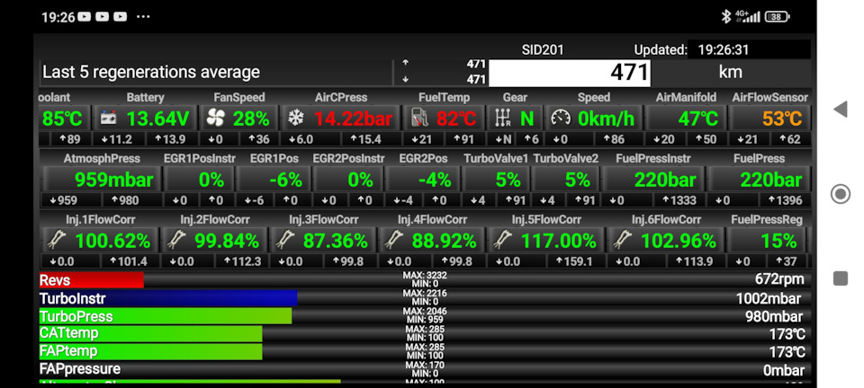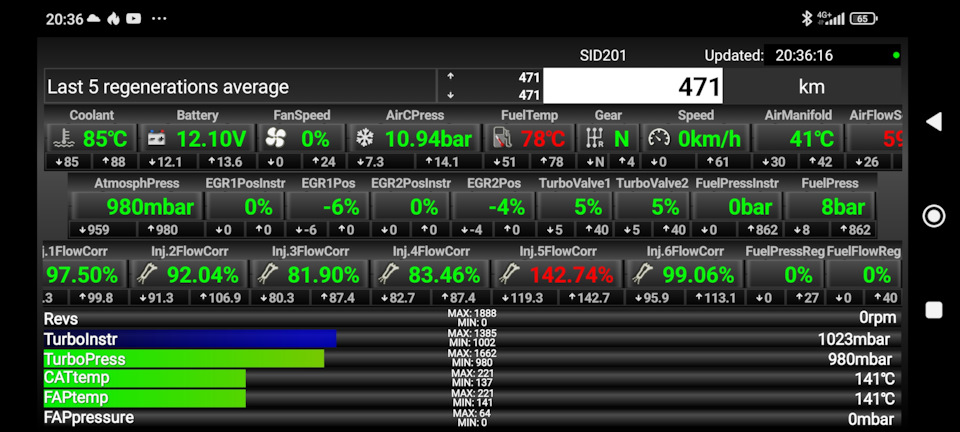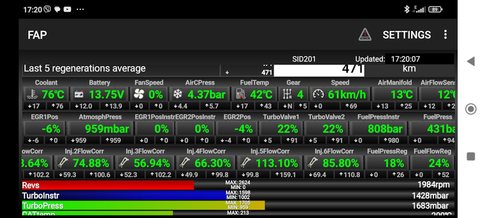 Пятая форсунка всегда была изгоем у меня, показывала самую не красивую коррекцию 71%, иногда можно было увидеть 66%. И вот недавно, в сентябре это было, приезжаю значит на рынок, мотор не глушу, чего то мне захотелось глянуть через elm, не помню уже, подключаюсь и вижу коррекцию 5 форсунки что то в районе 56% и тут я понимаю что пора туда вмешиваться, мотор не глушу, продолжаю наблюдать ещё минут 5, коррекция продолжает падать дальше, на каждый упавший процент я делаю скрин, думая что он будет последний, в итоге скринов получилось много, коррекция опустилась до 39%! Как вам такое?) Мотор при этом продолжает обычно работать, никаких ошибок, валит как положено, в общем заглушил и пошел по делам.