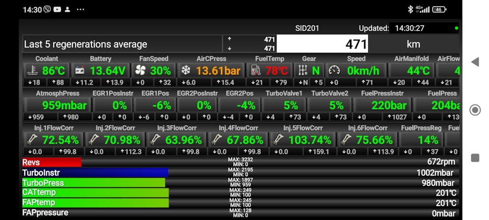 Всё кажется вроде ничего, работает, слегка подколбашивает, но если заглянуть в этот момент на коррекцию, можно инфаркт получить — картина там: "все 6 форсунок на помойку" — все кроме пятой в районе 60%, а пятая доходила до 159%, все начали бунтовать от нового гостя и будто адаптироваться под него.