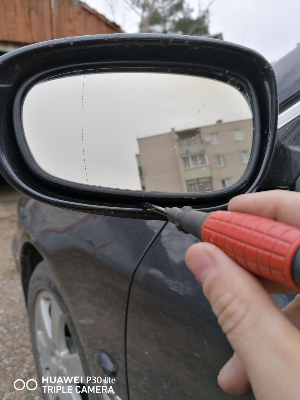 .Отщелкиваем отверткой защелку и снимаем сам корпус зеркала
