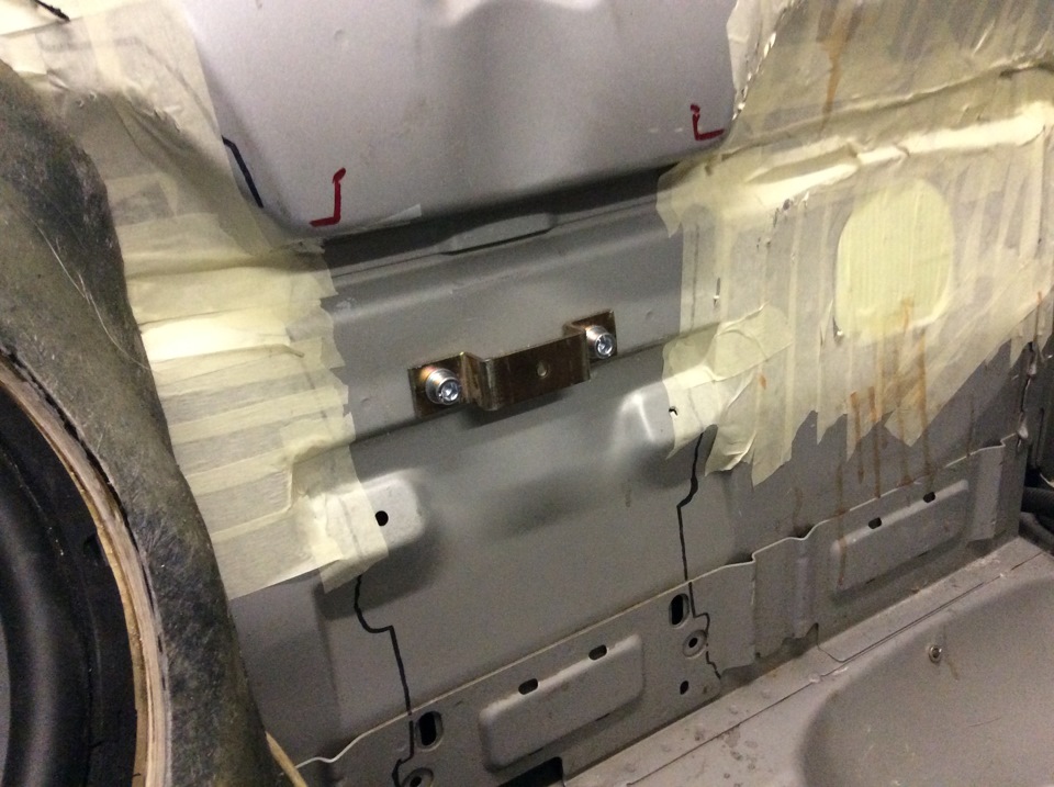 А по правую руку у кпп пришлось варить, со стороны днища была приварена пластина, к ней гайка, просверлены дырки в днище, обработаны антикором, после ремень был закреплен. Угол получился 1в1 как слева.