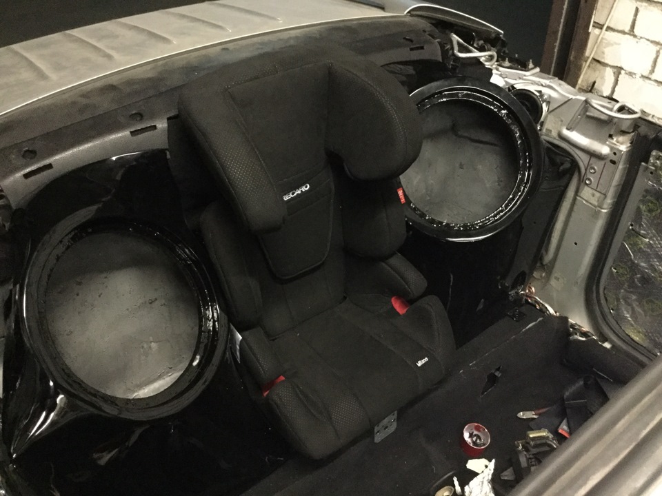 Вместо задних сидений было решено установить детское кресло, ничего другого туда попросту не влазило, а тут recaro))) а по бокам добавить немножко сабов (про них я напишу отдельно чуть чуть позже).