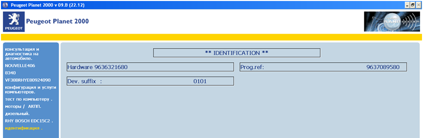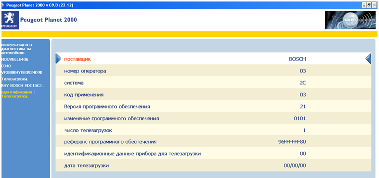 Я снова по поводу телезагрузки. Добрался на выходных к своей машине, решился на телезагрузку.Процесс осуществить мне не удалось.Опишу по шагам.1. В PP2000 v22.12 выбираю телезагрузку, затем выбираю тип двигателя и мозга.2.На следующем экране спрашивается, хочу ли я следать дистанционную телезагрузку (то есть через инет). Отвечаю "НЭТ!", иначе пытается соединиться с сервером PSA.3. Следующий экран говорит, что "калькулятор содержит последнее обновление".4. Жму ОК, затем спрашивается "автомобиль с кузовом berline?" (я так понимаю "седан"). Отвечаю "ДА".5. Через секунду пишет "процедура загрузки данных завершена. выкл и вкл зажигания. Жму ОК и выводит снова на главный экран.Собственно в идентификации мозга мотора значится Prog ref 9637089580В меню "идентификация телезагрузка" пишется реферанс ПО 96FFFFFF80. В меню мотора RHY, где считывание ошибок, тесты исполнителных элементов и пр. пунктов телезагрузки и телекодировки нету. Подскажите, пожалуйста, как телезагрузить ЭБУ!