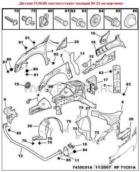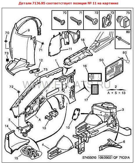 Подскажите, нужен номер кусочка защиты спереди справа, который закрывает от грязи ремни и шкив коленвала есть предположение, что это 7136.N5 Спасибо.