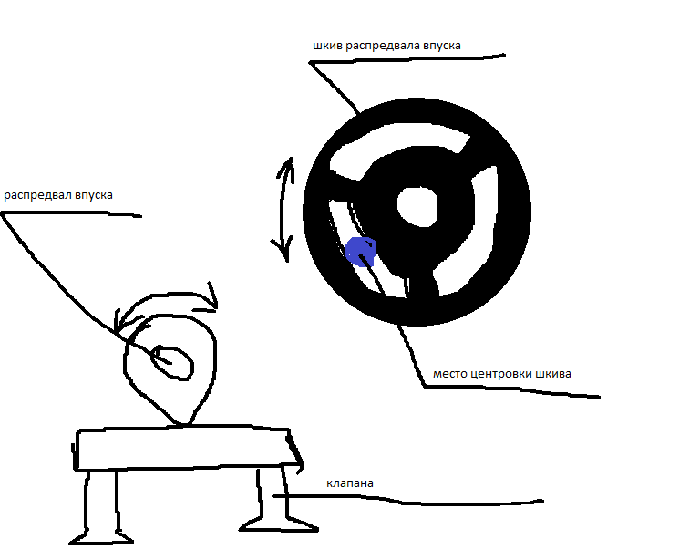 Ребят,только не смейтесь над художеством,всё очень приблизительно.Недавно менял ремень ГРМ,загвоздка была вот в чём.На шкиве впускного распредвала отверстие под центровку ну очень растянутое(как на рисунке),соотв-но шкив гулял туда-сюда при установке.Выставил метки мелом,маркером и постарался поставить как стоял старый ремень.Получалось как на рисунке и по ощущениям в этот момент впускные клапана были максимально открытыми.Естественно что я мог ошибиться на зубчик-другой в обе стороны.То,что это не смертельно я знаю уже недели две,характеристики двигла не поменялись,завелся сразу,но правильно ли это.Опирался на старый мануал от 607-го(там было описание и нашегодвижка и замены ремня ГРМ),но в нём отверстия были круглыми и конечно совпадали.помогите кто чем может.