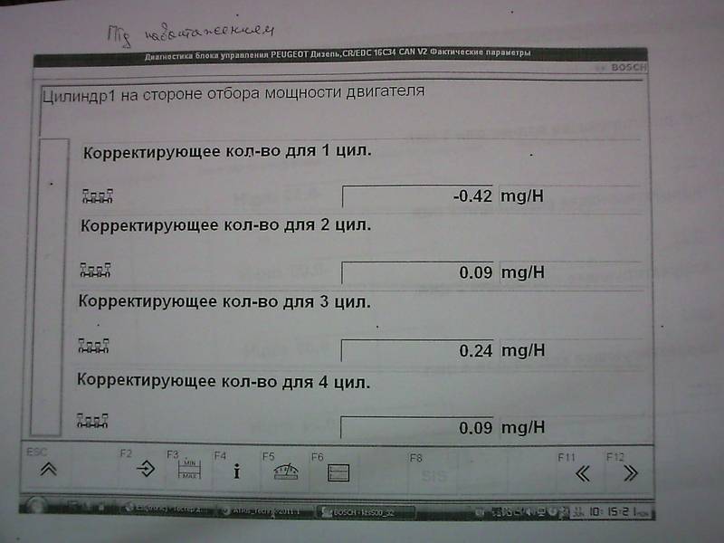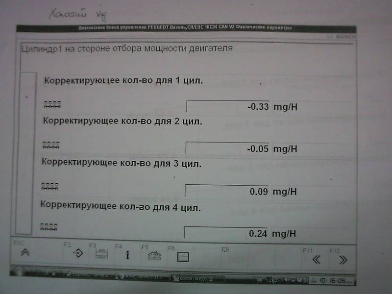Ура вчера заехал на очередной сервис по ремонту дизелей и сразу предупредил, что программы Пежо Планет и Лексия 3 не читают корекцию форсунок. Ребята спокойносказали што попробуют другой программой. Подключили программу Bosch KTS500 и о чудо через 30минут скитания по разным характеристикам мастер нашел корекцию. Корекция как и ожидалось была в норме и они сказали, что не возьмутся за даную проблему, потому что не знают что делать и нету стенда - даже деньги за диагностику не взяли. Мастер позвонил в Киев на сервис Бош и спросил насчет моих форсунок для проверки на стенде - ответ 200грн одна проверка на стенде по тест-плану. Вот некоторые данные распечатки по диагностике форсунок: