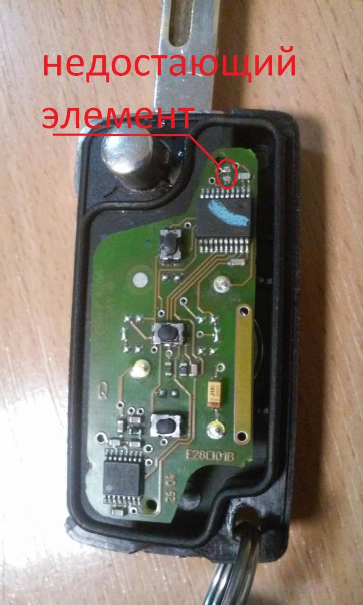 Прошу помощи у знающих людей либо у владельцев подобного 3-х кнопочного ключа peugeot: Суть проблемы. В один прекрасный момент перестал работать центральный замок от брелка. Обычная замена батарейки не помогла. При более детальном осмотре платы, обнаружил отсутствие одного smd компонента. Сам компонент видимо потерялся в процессе замены батарейки. Вот место установки этого компонента: Собственно вопрос. Что это за компонент? Может у кого есть на разборке такой ключ, либо есть возможность промерять на своем ключе - что там впаяно, и какими характеристиками обладает. Поиск по знакомым и незнакомым не дал результата, т.к. видимо с какого-то года стали делать немного другие платы на 3-х кнопочные ключи. Поэтому прошу помощи здесь.