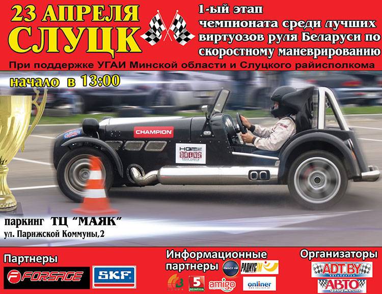 Уже 23 апреля в Слуцке состоится первый из пяти этапов чемпионата среди лучших виртуозов руля Беларуси! Проводится отдельный зачет для любителей! Только абсолютный зачет! Деления на классы нет! Есть призы в каждой зачетной группе! Календарь проведения: 23 апреля – Слуцк, 1-ый этап 14 мая – Солигорск, 2-ой этап 3-ий этап 28 мая – Молодечно 4-ый этап 11 (12)июня – Борисов 5-ый этап 10 июля – (Минск. Возможна замена места проведения!) Все регламенты размещены и заявка на участие в соревнованиях размещены здесь- http://adt.by/sluck-pervym-vstretit-luchshix-virtuozov-rulya/ Интереснейшая борьба в разных городах городах Минской области при большом количестве зрителей! Лицензия не нужна!!! Есть заявочный взнос и страховка. Все указано в регламентах.