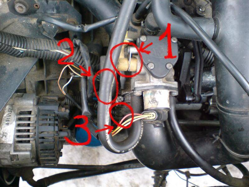 Помогите разобраться, где какой датчик? Согластно нумерации на фото, машина та же -- ПЕЖО 405, 1.6 МОНО, 1994г.в.: № 1 - ??? № 2 - датчик положения дроссельной заслонки (потенциометр). № 3 - ??? Спасибо! Думаю для многих будет полезная информация...