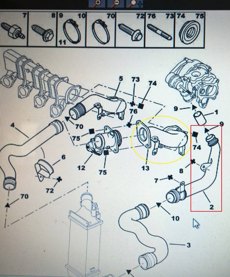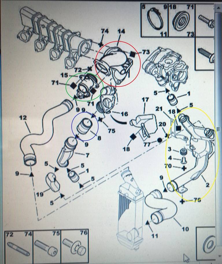 Привет ! Поехал к диагносту следующими проблемами: Машина не ехала, были провалы в при движении, Сильно дымила, турбина дула, а резвости нету совсем Нестабильный ХХ, повысился расход Подключили к компу, итог Замена форсунок, первая умерла совсем, третья на подходе. Замена датчика высокого давления топлива, забит намертво. По дымности и отсутствию тяги нашли разорванный патрубок за двигателем. Решил изменить всю конструкцию подачи воздуха. Сейчас на схемах попытаюсь пояснить \ В синим кружочке патрубок который разорвало. Для изменения конструкции ВЫбрасываем патрубок в желтом круге, деталь в красном круге и заменяем деталями на Схеме №2 от двигателя 2,0 HDI без катализатора обозначенными желтым и красным. Так же рекомендовано на схеме №1 деталь в зеленом кружечке заменить на аналог только без заслонки с которой вечно сопливит масло. Парни простите, за такой не профессионализм в названиях. Думаю для вас все понятно стало И если кто знает правильные названия и обозначения деталей ОЧЕНЬ СИЛЬНО ПРОШУ ВАС ТУТ НАПИСАТЬ. а то нужно же будет искать на разборках, и хочется правильно излагаться.