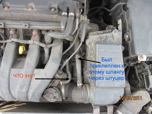 Езжу уже более 8 лет на машине. Заметил что конец одного шланга замотан изолентой. А место где он должен быть приклеплен - штуцер обломан. Подскажите ЧТО ЭТО?