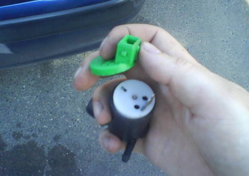 Перестал омыватель работать, проверил все шланги от моторчика начиная, без проблем продуваются.Долез до маторчика и начал тестировать .1. снял фишку и нажимая на стрекозе замерил - 12 вольт идет на фишку, как бы провод не крутил.2. поставил обратно и надавил на часть с фишкой в направлении, указанном стрелками - заработал! Причем чем дальше давлю тем увереннее работает. Перестаю давить, мощность постепенно падает и вообще не работает снова.Появилось 2 вопроса:1. как снять моторчик? просто потянуть за черную часть в направлении от бачка и вынуть из бачка? ничего тама не держит его?2. сам моторчик разборный? зеленая часть снимается? потому что по итогам моих тестов я подумываю, что что-то именно в этой части отходит.