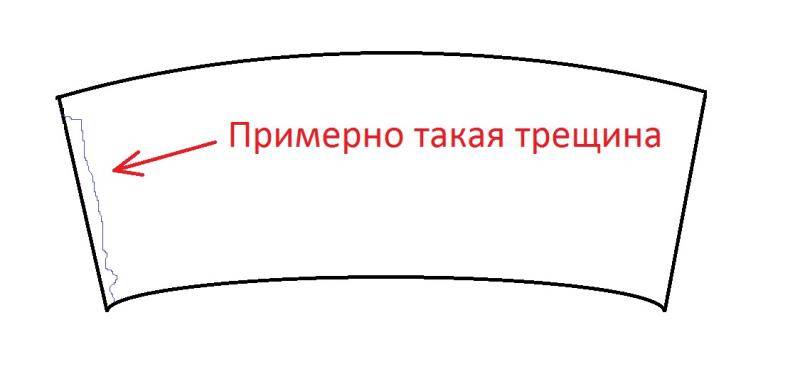 Добрый вечер, форумчане!Интересует такой вопрос: у меня на лобовом стекле появилась трещина и разошлась вдоль правой стойки, примерно сантиметра 4 от края стекла. А через неделю проходить тех.осмотр. Поменять стекло, сами понимаете, дело не из дешёвых, да ещё и оригинальное и с датчиком дождя. В общем родилась мысль, чтобы немного уменьшить ход дворников. Мне нужно выиграть хотя бы сантиметра два у размаха, и тогда стеклоочиститель не будет задевать трещину, а следовательно замену стекла можно отложить.Может кто посоветовать как можно уменьшить размах?Пример трещина я отобразил на рисунке.