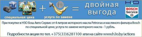 С 5 марта 2018 при покупке в H3O Бош Авто Сервис от 4-х литров моторного масла Petronas и масляного фильтра Bosch по специальной цене*, стоимость замены масла в автомобиле – 1 рубль.Замена масла по акции производится только по предварительной записи.Наличие фильтров уточняйте по телефону +375336281100 Центр обслуживания автомобилей H3O: Бош Авто Сервис, мойка, детейлинг.