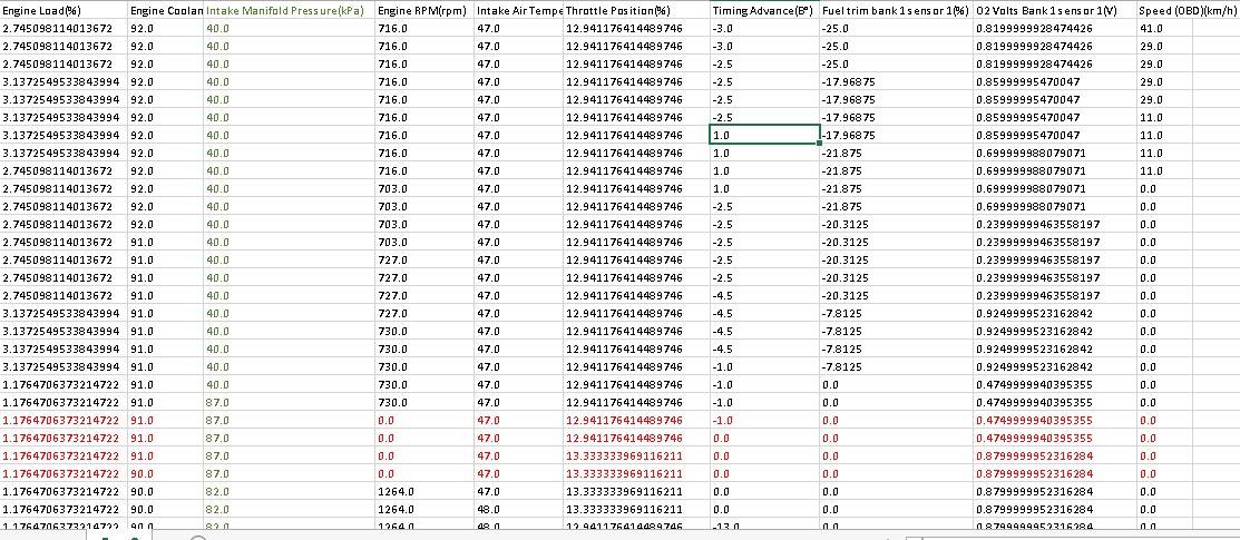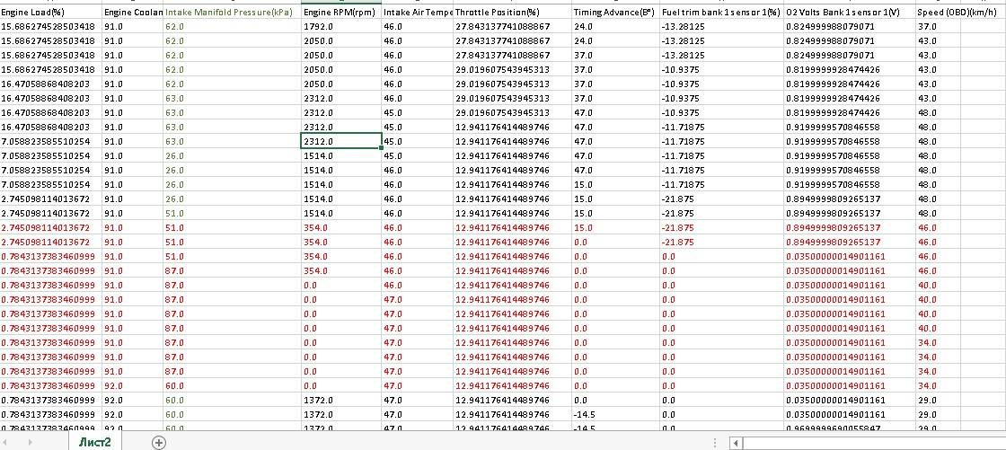 Помогите разобраться, снял лог показаний параметров двигателя по ОБД, криминала не увидел. Не устойчивый хх + самое неприятное периодически глохнет на хх. Может кто заметит неправильное значение. Красным когда тузик заглох.