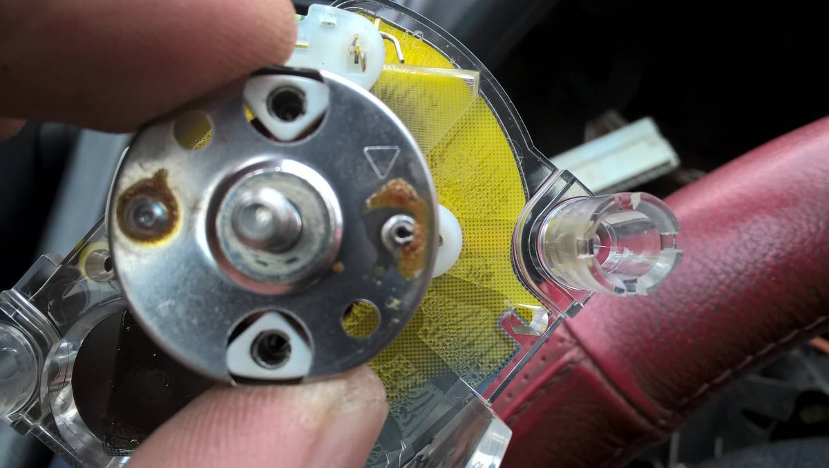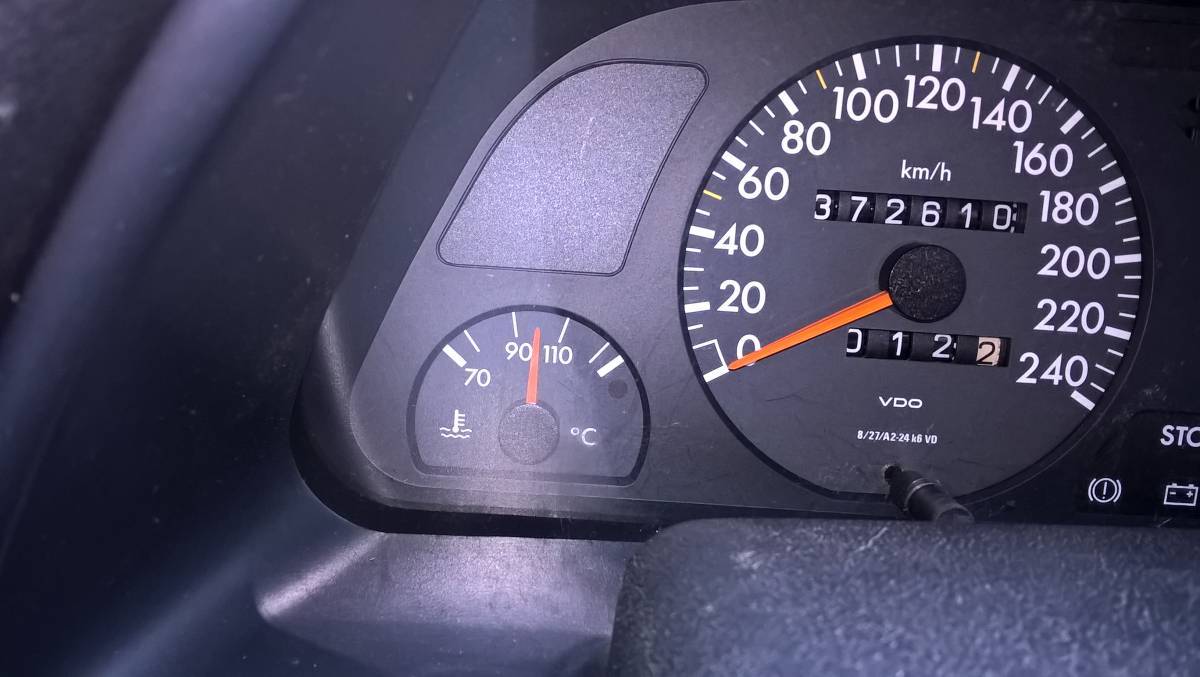 Итак, вчера разобрал панель, снял датчик температуры, и обнаружил в двух местах треснувшую пайку на корпусе. Аналогичная ситуация была и с индикатором топлива - там вообще как-будто один контакт не был запаян до конца. Запаял их соответственно, заодно и поменял лампочки сгоревшие на панели. Сегодня пробовал ездить - все вроде нормально стало. Стрелка топлива перестала прыгать, показывает где-то половину половины бака, на вскидку там должно остаться где-то литров 10 топлива. (сколько емкость бака, кстати?). Температура тоже держится ровно уже, 90 градусов показывает, ездил правда немного совсем пока. Специально выждал, пока сработает первая скорость вентилятора - на датчике было что-то чуть меньше 100 градусов, правда когда сработали вентиляторы, стрелка чуток дернулась вперед(фото прилагается). Еще у меня прыгала и стрелка давления масла, точнее она начинает показывать сразу же, как только включаешь зажигание. Так вот с индикатором давления уже немного сложнее. Он расположен на одной плате с тахометром, и визуально вроде никаких дефектов не обнаружено, так что пока с этим датчиком не знаю, что делать. Да, еще одна интересная вещь нашлась - не горел индикатор включенной подсветки, габаритов, точнее. Лампочка рабочая оказалась, проверяю - не приходит напряжение. Проверяю по дорожкам, какие провода должны идти. И нахожу, что один провод есть в штекере, а второго вообще попросту нету. Т.е вроде как вообще его там и не стояло.