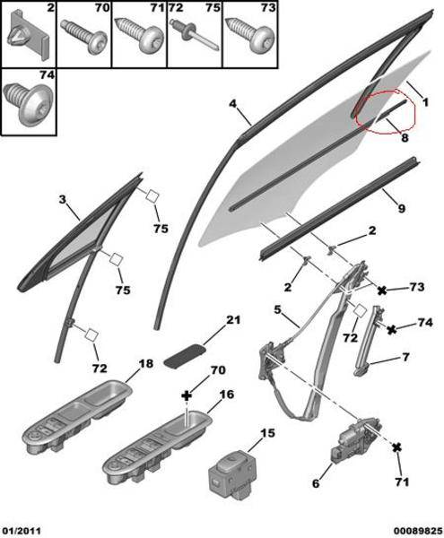 Выскочил из крепления внешний уплотнитель стекла (передняя пассажирская дверь, на рисунке под номером 8) - край резинки этой загнулся кверху, на место не становится Как он вообще крепится - можно приклеить или он просто вставляется в пазы? Если последнее, то уплотнитель под замену? Спасибо.
