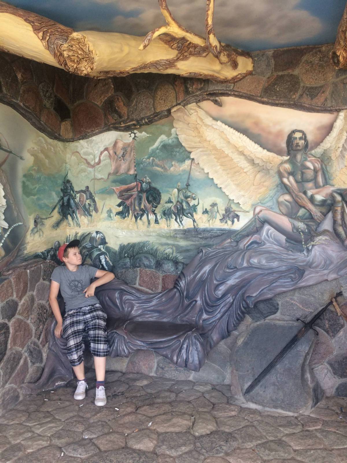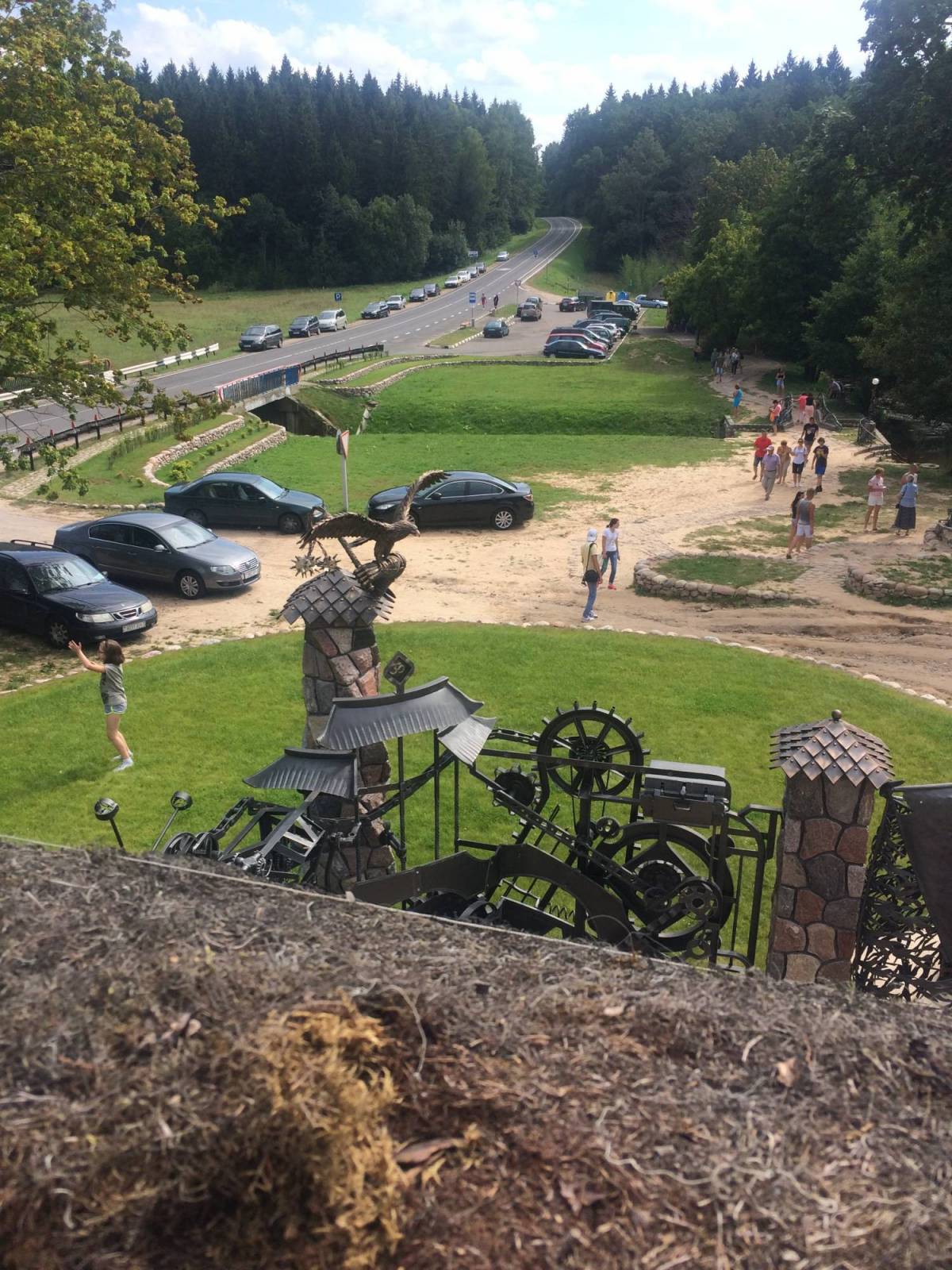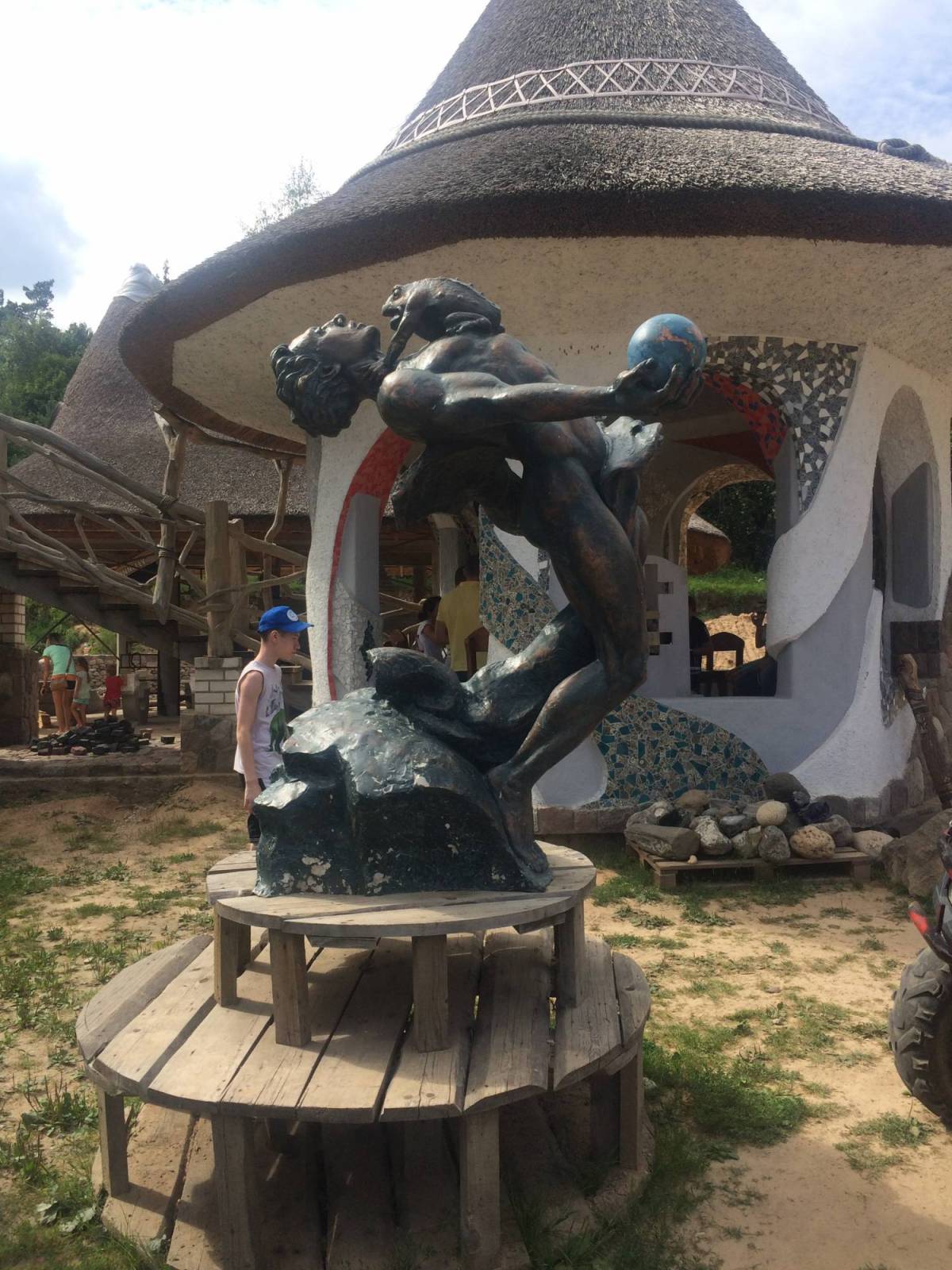 Попалась как-то на просторах интернета статья про бизнесмена из Новогрудка и его фентези-усадьбу... ну и, ессесно, было решено посетить ее во что бы то ни стало, что и было осуществлено в августе 2018г. Забегая слегка на перед, скажу, что на данный момент судьба усадьбы под вопросом... Выезжали из Новополоцка (Витебская обл.) утром - около 9-00, лайнер: Мерседес С-класса (2,7 CDI), экипаж: водитель+штурман и двое детей :-) Общий пробег составил: около 800км, топлива съедено: около 50л. Итак... Приехали в усадьбу около 13 часов... машин очень много, регионы разные,правда 2 всего одна машина, мой "пепелац" Место ооочень атмосферное, наводит на разные философские мысли, а после знакомства с хозяином усадьбы открылось другое видение . Играет музычка, ходят люди, все можно посмотреть и потрогать, что немаловажно. Дети в восторге от увиденного и от рассказов хозяина сих мест: — Все это появилось в ночь кровавой луны. Вся деревня покрылась беспросветным дымом и мглой, стоял загробный вой… Именно так всем рассказывал Сергей. Возле дома есть остановка, когда совершенно обычная синего цвета, но теперь это целое произведение искусства, с гравюрами и даже картой всех замков Беларуси. Чуть дальше остановки - озеро и пляж, которых тоже коснулась мысль облагораживания Под мостом дракон охраняет каменное яйцо, кованый мостик, беседки, мангал и даже выездная точка общ.питания (шашлык-башлык). Усадьбу охраняет кованая собака с чешуёй и рогами, которая появилась со слов Сергея в ночь все той же "кровавой луны". Сидит собака на знатной цепи и хорошим людям бояться нечего: пес их не замечает ...Дом гномиков, ковчег, Колизей и колодец с алкоголем.... всё это есть.... "Дух леса", гравюра "Падший ангел", скульптура "Жаба, душащая человека"... Рядом с домом бытовка, которая украшена мобильными телефонами... прям гвоздями, прям в стену... Дом... дом с историей, как говорит сам хозяин: — Я этот дом купил у бывшего председателя горисполкома. Он долго не хотел его продавать, но я добился своего. Я очень хотел заполучить именно этот домик: он с историей. В августе 1969 года здесь целую неделю прожил Владимир Высоцкий с Мариной Влади. Я решил, что обязан сохранить стены дома и ничего не сносить. В общем и целом, подводя итог, хочу сказать: Лучше одни раз увидеть, чем 100 раз прочитать! Здесь уточню, что на данный момент усадьба закрыта для посещений, причины вы с легкостью найдете в интернете.