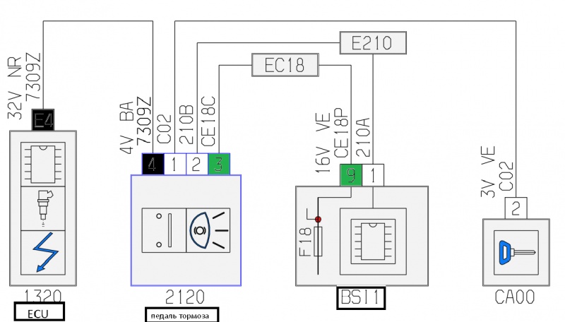 Черным и зеленым отмечены два недостающих провода. Зеленый можно срастить с постоянным "+" концевика педали сцепления( в не нажатом положении контакт замкнут). Черный провод нужно протянуть в моторник, к черному 32-х контактному разьему, в гнездо Е4. Порядковый номер этих двух проводов на педали тормоза значения не имеет, главное чтоб контакт в не нажатом положении был замкнут.P.S На своем моторе подключил по такой схеме. Все работает.