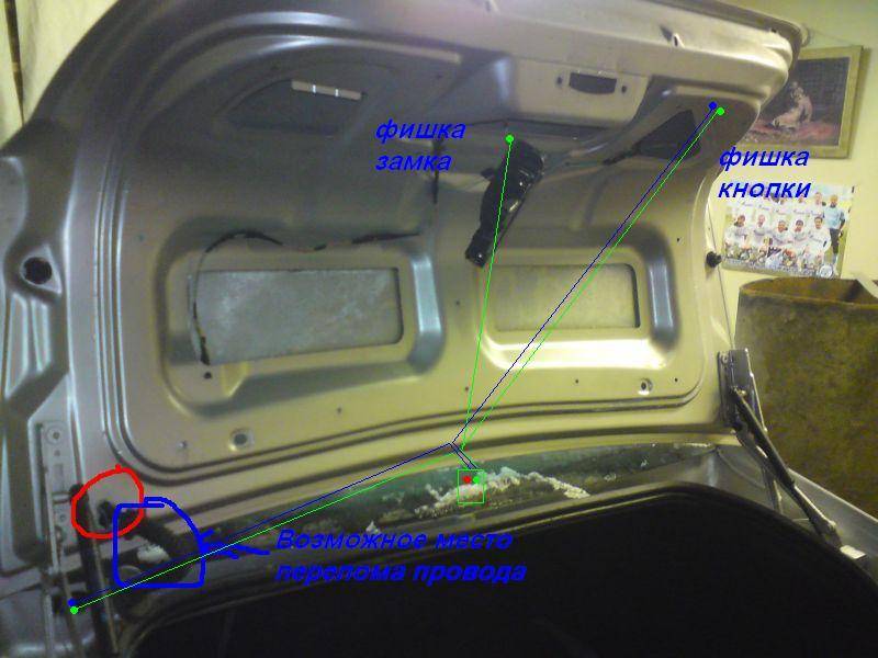 3) Провода под резинкой визуально целые, придётся снять обшивку крышки багажника! Как я не старался спасти пистоны нихрена не получилось или зубья все отломаются,или шапка отлетит, причём второй вариант похуже потому, что вторая часть пистона может упасть в крышку багажника, в итоге получаем не приятные звуки при открытии\ закрытии. Далее Нам нужно прозвонить провода Синий и Зелёный начиная от места изгиба с левой стороный там где провода уходят в салон авто, до фишки на кнопке. Тут уже смотрите сами, можно снять фишку с кнопки, можно снять саму кнопку вместе с фишкой, а можно умудриться не снимая ничего. Я снял кнопку и без проблем отсоеденил фишку. Прозваниваем провода (кстати зелёный нужно будет на всякий случай прозвонить и на фишку самого замка) и на этом этапе скарее всего вы обноружите перелом провода. Меняем кусок повреждённого провода, проверяем должно работать. Ниже на картинках варианты прозвонки, прозванивайте сначало без снятия обшивки.