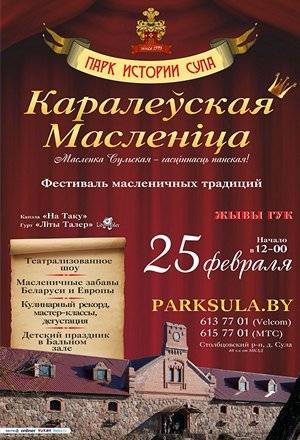 Всем привет! Приближается весна, а чтобы она пришла вовремя, ее нужно хорошенько позвать и провести зиму. Поэтому мы решили совместить два мероприятия - посетить Парк истории Сула (давно уже хотим там побывать) и отпраздновать фестиваль масленичных традиций. Откроет программу праздника красочное театрализованное представление с участием артистов в исторических костюмах, а также самих зрителей, часть которых сможет на время стать участниками событий конца XVI века. По окончании действия Парк-музей Интерактивной Истории предложит всем богатый выбор самых различных способов отдохнуть и набраться позитивных эмоций! Весь день на территории комплекса будет звучать живая музыка в исполнении музыкальных гостей фестиваля – группа «Літы Талер» и капелла «На Таку». Для всех, у кого ноги сами начнут проситься в пляс, пройдут мастер-классы по старинным шляхетским и народным танцам. Наставниками для любителей подвигаться «як мае быць» станут участники арт-группы Парка-музея Интерактивной Истории «Сула» и мастера танца из Клуба традиционного танца «Сіта». Все желающие смогут посмотреть новый масленичный спектакль сульской батлейки под названием «Як пан Андрусь Масленку сустракаў». Занятие для себя смогут найти и самые юные гости фестиваля, для которых в тёплой Королевской Ассамблее будет организована особая детская развлекательная программа. В фестивальной программе также: традиционные масленичные забавы Беларуси с веселыми призами; старинные масленичные забавы стран Европы с награждением победителей; дегустация продукции сульского бровара; ремесленная ярмарка; выпекание рекордной 2-х метровой смажни и её дегустация гостями фестиваля; кулинарные мастер-классы от главы Гильдии поваров и шеф-поваров Беларуси Александра Чикилевского; старинный аттракцион «Волатаў Крок»; веселая масленичная «заездка» лошадей на аттракционе «Жвавы жарэбчык»; стрельба из лука и арбалета с лотереей и призами; изысканные блюда в ресторане «Вясёлы Пан»; масленичная кухня в «Королевской Ассамблее»; возможность быстро перекусить, не покидая главной площади фестиваля, в праздничном шатре; масленичная «баба на возу»; финальный костёр и огненное представление с участием гостей; катание на лошадях; катание на вертолете (при условии лётной погоды!); посещение дома-музея Ленских. Дата: 25 февраля 2017 года. Начало: в 12:00. Место проведения: Парк-музей Интерактивной Истории «Сула», Минская область, Литвенский с/с, д. Сула, 14. Стоимость: 10 руб. – взрослый, 5 руб. – дети школьного возраста, дошкольники – бесплатно. В стоимость входного билета на фестиваль включены: - вход на территорию комплекса; - участие в театрализованных фестивальных блоках и представлениях; - участие в масленичных играх и соревнованиях с призами; - посещение 9-и постоянно действующих анимационных точек; - концерт группы "Літы Талер"; - выступление капеллы "На Таку"; - мастер-классы по шляхетским и народным танцам; - праздничная программа для детей в тёплом помещении; - дегустация сульской старки; - участие в выпекании и дегустации королевской смажни; - кулинарные мастер-классы от Александра Чикилевского; - ремесленная ярмарка; - посещение музея Ленских; - посещение сульской батлейки с авторским масленичным спектаклем. За отдельную плату: - питание в ресторане и на нескольких фуд-кортах; - катание в б