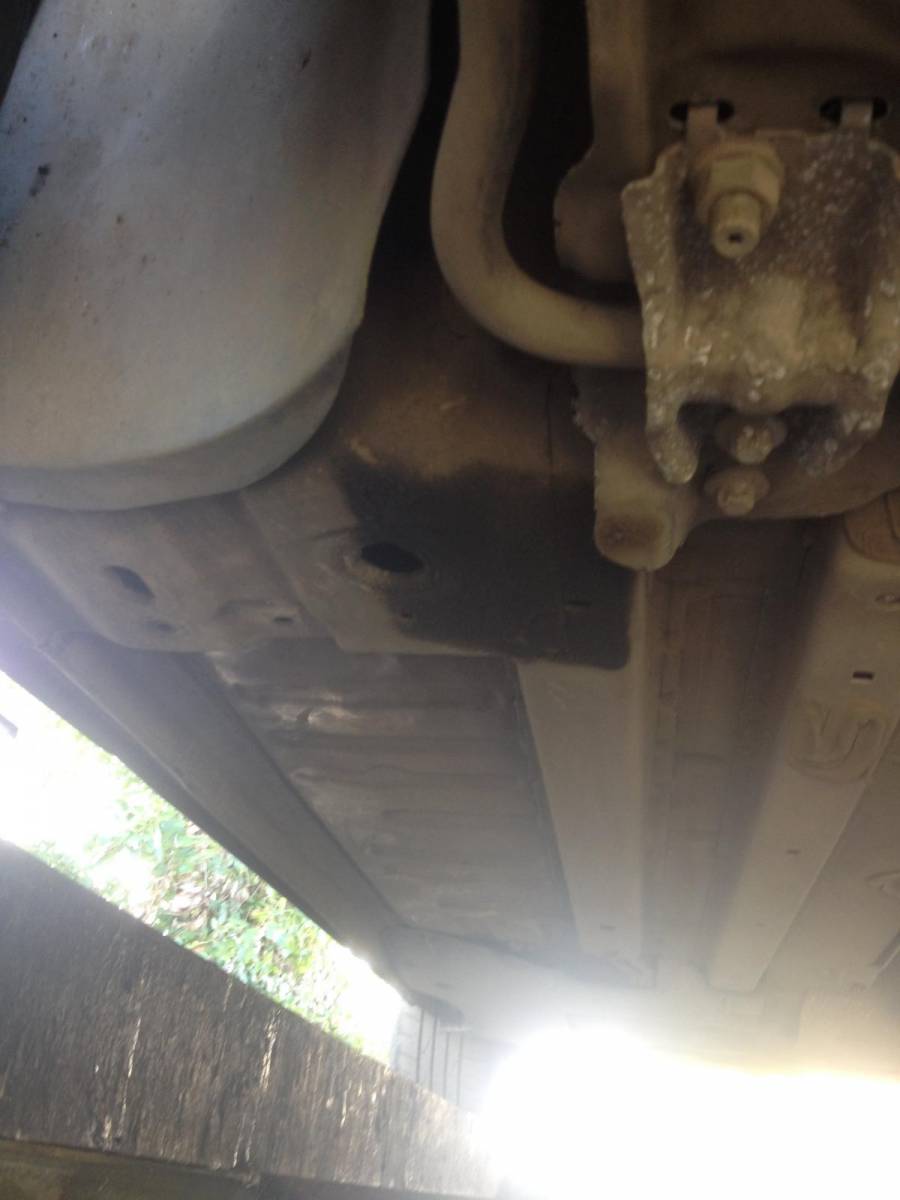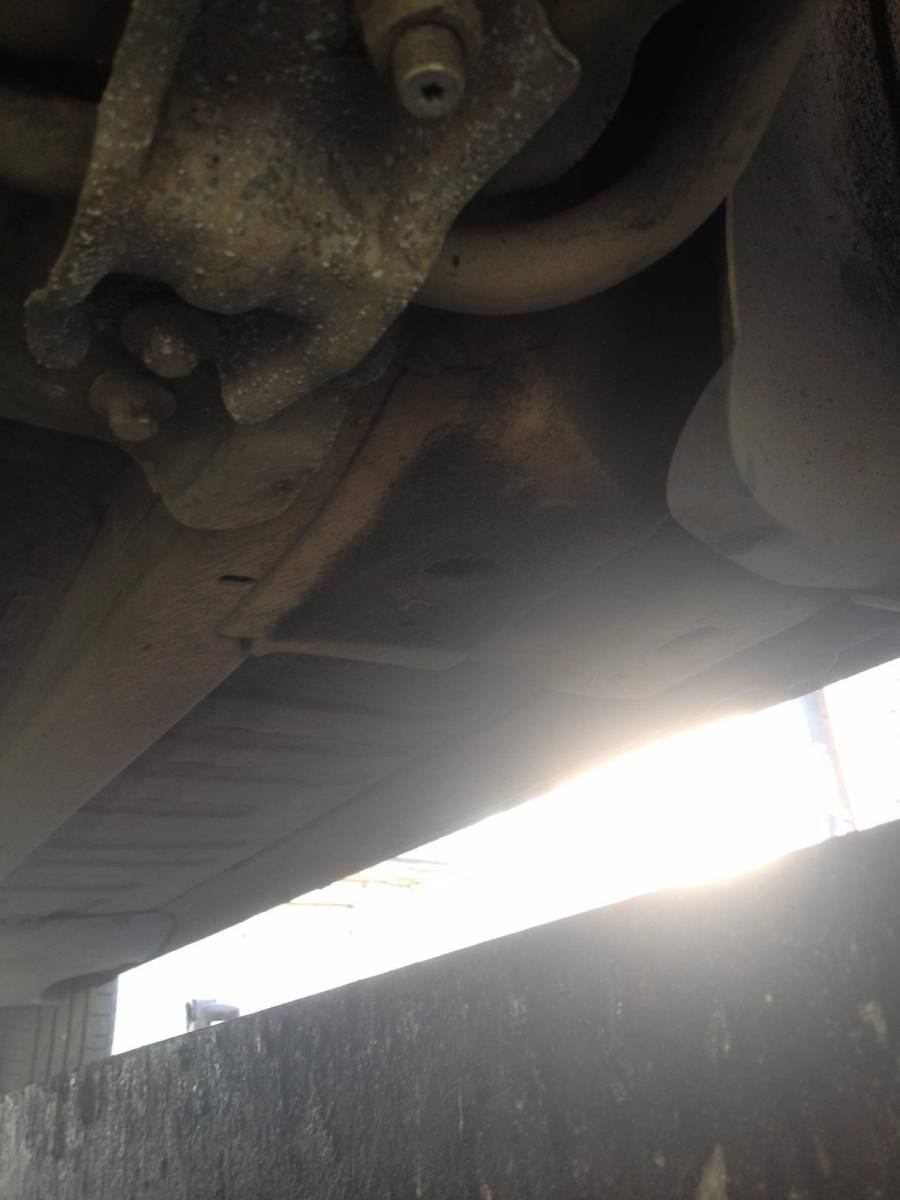 Всем привет. Вчера заехал на эстакаду, т.к. с момента покупки туда не лазил ни разу. И увидел какие-то черные пятна, от чего непонятно. Все днище сухое, а пятна слегка сырые и мажутся черным. Всего их четыре, расположены симметрично. Отчего они могут быть? И что за отверстия возле них? По идее на зиму надо закупорить?